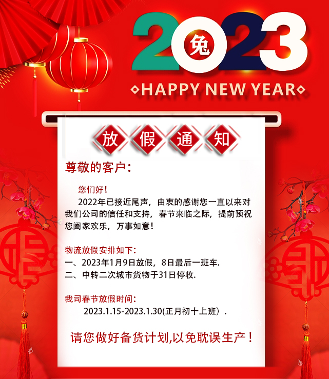 尊敬的客戶(hù): 您們好! 2022年已接近尾聲,由衷的感謝您一直以來(lái)對(duì)我們公司的信任和支持;春節(jié)來(lái)臨之際,提前預(yù)祝您闔家歡樂(lè),萬(wàn)事如意! 物流放假安排如下: 一、2023年1月9號(hào)放假,2023年1月8日最后一班車(chē)。 二、中轉(zhuǎn)二次城市貨物于本月31日停收。 我司春節(jié)放假時(shí)間: 2023年1月15日(農(nóng)歷二零二二年十二月二十四日 星期天)至1月30日(農(nóng)歷二零二三年正月初九 星期一)春節(jié)放假; 2023年1月31日(農(nóng)歷二零二三年正月初十 ...