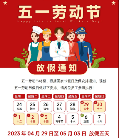 五一勞動(dòng)節(jié)將至,根據(jù)國(guó)家節(jié)假日放假安排通知,現(xiàn)就五一勞動(dòng)節(jié)假日做以下安排,請(qǐng)各位員工參照?qǐng)?zhí)行! 2023年04月29日至05月03日 放假五天 請(qǐng)客戶(hù)做好備貨計(jì)劃,以免耽誤生產(chǎn)! 祝福全體員工五一勞動(dòng)節(jié)快樂(lè),放假期間外出清注意人身安全。
