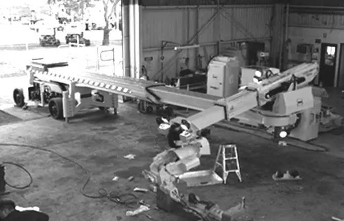 自 20 世紀 60 年代末美國明尼蘇達州的 PaR 公司開始從事大型磨機換襯板機械手的研究至今,世界上許多國家的有色和黑色金屬礦山選礦廠已經實現了磨機換襯板的機械化作業。美國、前蘇聯、芬蘭、澳大利亞等國的研究人員在此過程中取得了大量的成果,申報了多項專利,并己開發生產出了系列產品,以適應各種不同類型和規格的磨機。無論是球磨機、棒磨機,還是自磨機或半自磨機,大多都有相適應的不同類型的換襯板機械手為其服務。而這些設備也是依磨機類型、筒體直徑和長度、入口直徑的大小、最大的襯板質量以及磨機周圍的環境而專門設計的。在國外,2001 年換襯板機械手可以滿足磨機的最大筒體直徑達 11.6 m,磨機最大長度 12.2 m,抓吊襯板最大質量達 3 636 kg。澳大利亞 RME 公司近期已生產出了抓吊襯板質量達4 545 kg 的磨機換襯板機械手 (見圖 1)。目前,美國 PaR 公司和澳大利亞  RME 公司是世界上比較出名的換襯機械手生產公司,生產的換襯板機械手均已形成系列,從抓吊襯板質量 1 0005 000 kg 各種型號均可生產。隨著換襯板機械化的發展,適應中小型磨機的換襯板設備也日趨完善并得到推廣。美國 PaR 公司在 20 世紀 80 年代研制出的 MLH-130 型換襯板機械手可適用于最小筒體直徑 2.75 m、入口直徑 0.61 m 的磨機,而且,這類機械手的換襯板效率更高。
