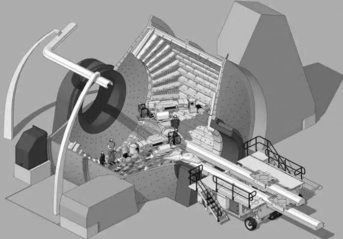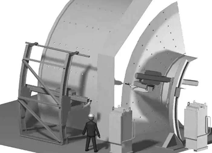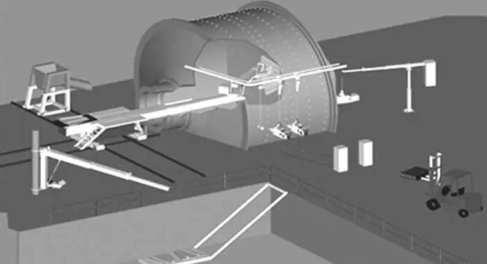 使用換襯板機械手對磨機進行換襯板作業無需卸去筒內鋼球,也不必排空礦石,只要礦石和鋼球面低于磨機孔口下沿 300 mm 左右即可作業。磨機停止運轉制動定位,移去給料或排料溜槽,使換襯板機械手吊裝或自行走近工作位置,將機座固牢于地面后,開動支承橫梁進入磨機筒體內的工作位置,即可進行換襯板作業。拆下的舊襯板只需用掛在抓具頭部的鏈鉤吊上小車送出筒外,新襯板用小車推入筒內,用抓具鉤牢后翻轉一個角度,送達安裝位置再經過上下左右調整角度后將其就位,插入螺栓,在筒體外由工人操縱風動搬手固定。新襯板通常是沿筒體水平線一層層裝換,視襯板尺寸的大小,每換裝約 3層,通過磨機微拖動裝置將筒體轉動相應角度后制動,換襯板繼續進行。筒體轉動時橫梁不必退出,出于安全考慮,人員必須全部撤出筒體。