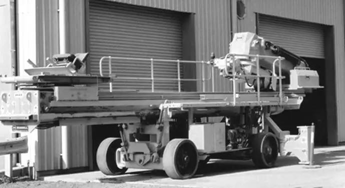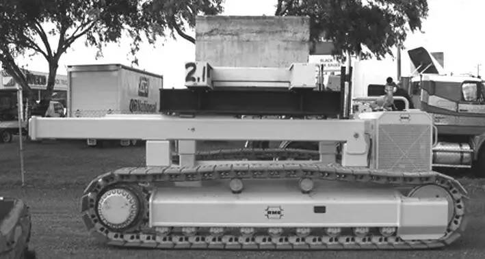 (2) 地面自行式 自行式機架分為輪胎式和履帶式兩種,如圖 所示。輪胎行走機架設有液壓缸支承的行走輪 (不充氣膠輪和液壓馬達驅動的驅動輪,由存放地走至工作位置后,液壓缸卸荷放至地面并被固定。