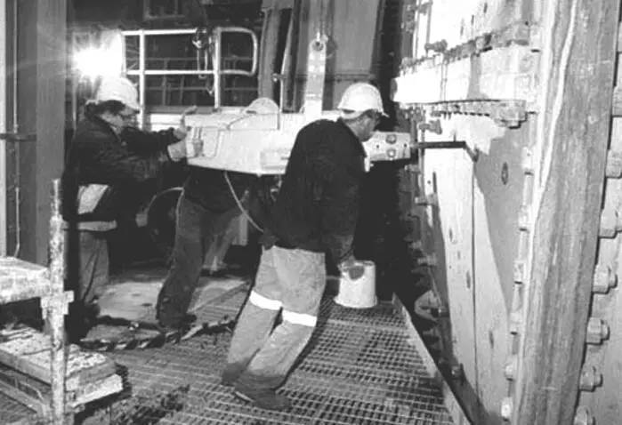 通過換襯板機械化來減少非運轉工時取得了明顯效果。早在 1979 年的明尼蘇達礦業設備年會上即顯示出,換襯板機械手的使用可使磨機的非運轉工時減少 46%,而美國漢納礦業公司的使用記錄證實這種減少可達 45% ~ 50%,并減少了勞動力。