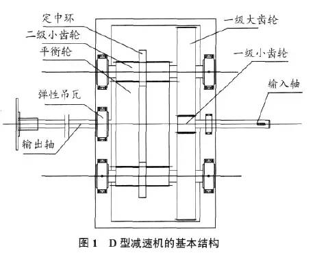 由圖1可知, D型減速機由兩級齒輪減速, 采用功率雙分流傳動的中心傳動機構, 輸入、輸出軸位于同一中心線。其內部六個齒輪, 分配在四根軸上。驅動功率自減速機中心輸入軸輸入, 由一級小齒輪傳送給兩側的一級大齒輪, 進行第一級減速。再由兩側齒輪軸上的二級小齒輪, 將功率均衡地傳送給中心的平衡大齒輪。經兩級減速后, 由中心輸出軸輸出。減速機運行時, 每一級都有兩對齒輪同時嚙合, 以分擔承載功率。