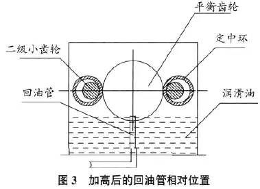( 1)改造潤滑系統。在第一次對設備失效原因分析時, 只考慮到強制潤滑系統的缺陷, 是造成設備失油的主要原因, 忽略了飛濺潤滑的作用。經測量發現減速機內靜態油面, 僅與一級減速大齒輪底部齒頂平齊; 這是因為強制潤滑系統的回油管高度低造成的。為使各齒輪和軸承得到更為充足的潤滑, 對潤滑系統進行了改造。將減速機內回油管加高, 使回油管高度高過一級減速大齒輪底部一個半齒, 以增加減速機內部貯油量和油面高度, 充分發揮飛濺潤滑的作用,見圖3。