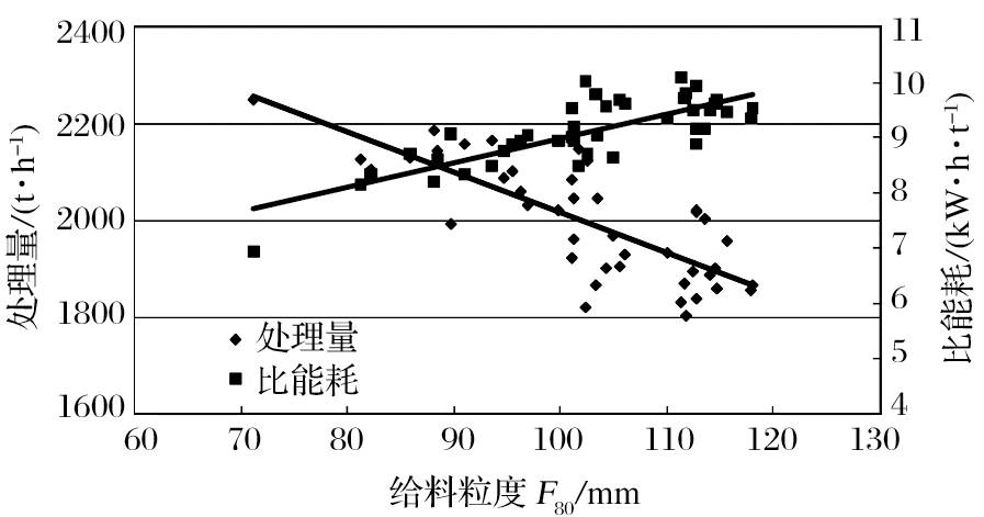 圖 1 某礦山給料粒度對(duì)半自磨機(jī)的影響