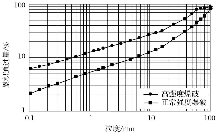 (1) 采礦時(shí)的爆破方式 爆破也是礦石的一道破碎工序,爆破方式選擇是否合理、安放炸藥量的多少都直接影響爆破后礦石的粒度組成,尤其是對(duì)細(xì)粒級(jí)含量的影響更大。圖 2 所示為不同爆破強(qiáng)度對(duì)礦石的粒度分布影響,顯然,高強(qiáng)度爆破后,礦石的粒度更細(xì),更適和半自磨機(jī)的給料粒度要求。