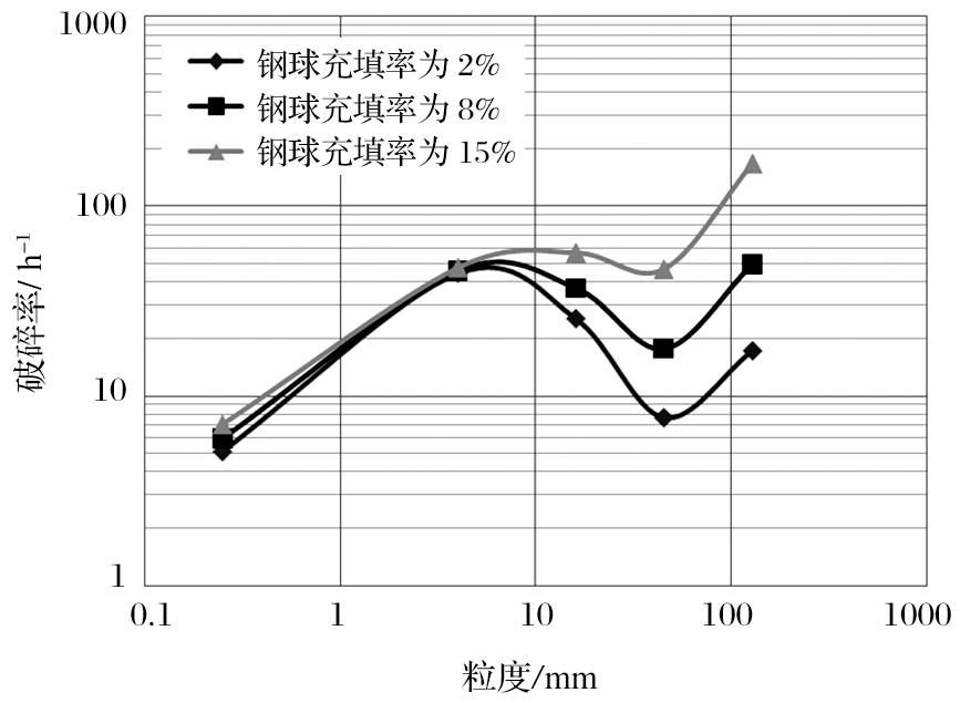 鋼球充填率對(duì)不同粒級(jí)物料的破碎效果不同,如圖 3 所示。從圖 3 可以看出,在處理 0.1 ~ 1.0 mm 粒級(jí)的物料時(shí),鋼球充填率越高,破碎效率越低;但在處理大于 10 mm 粒級(jí)的物料時(shí),鋼球充填率越高,破碎效率越高。