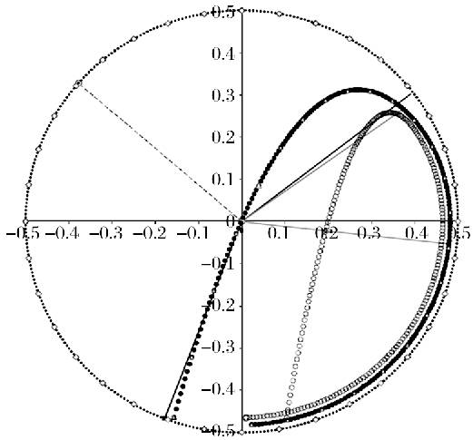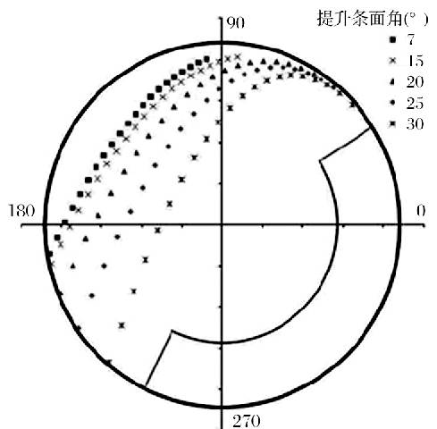 圖 6 不同提升條面角下鋼球的拋落軌跡