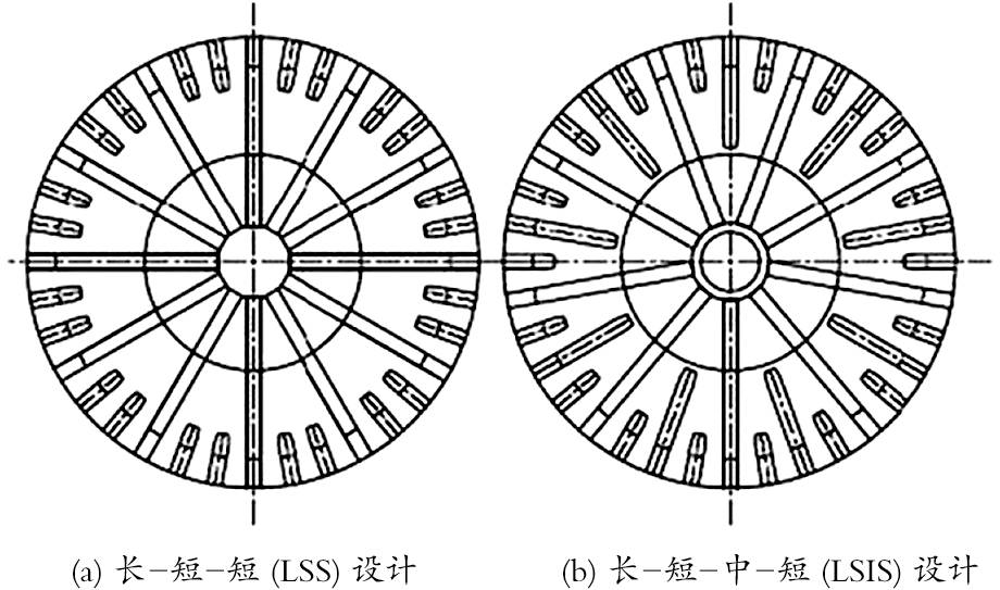 普通的礦漿提升器多采用輻射狀設(shè)計(jì),可以通過(guò)加大提升條的寬度、增加提升器型腔的有效容積 (見(jiàn)圖 10) 及改變礦漿提升條的布排方式 (見(jiàn)圖 11) 來(lái)提高礦漿的提升能力。